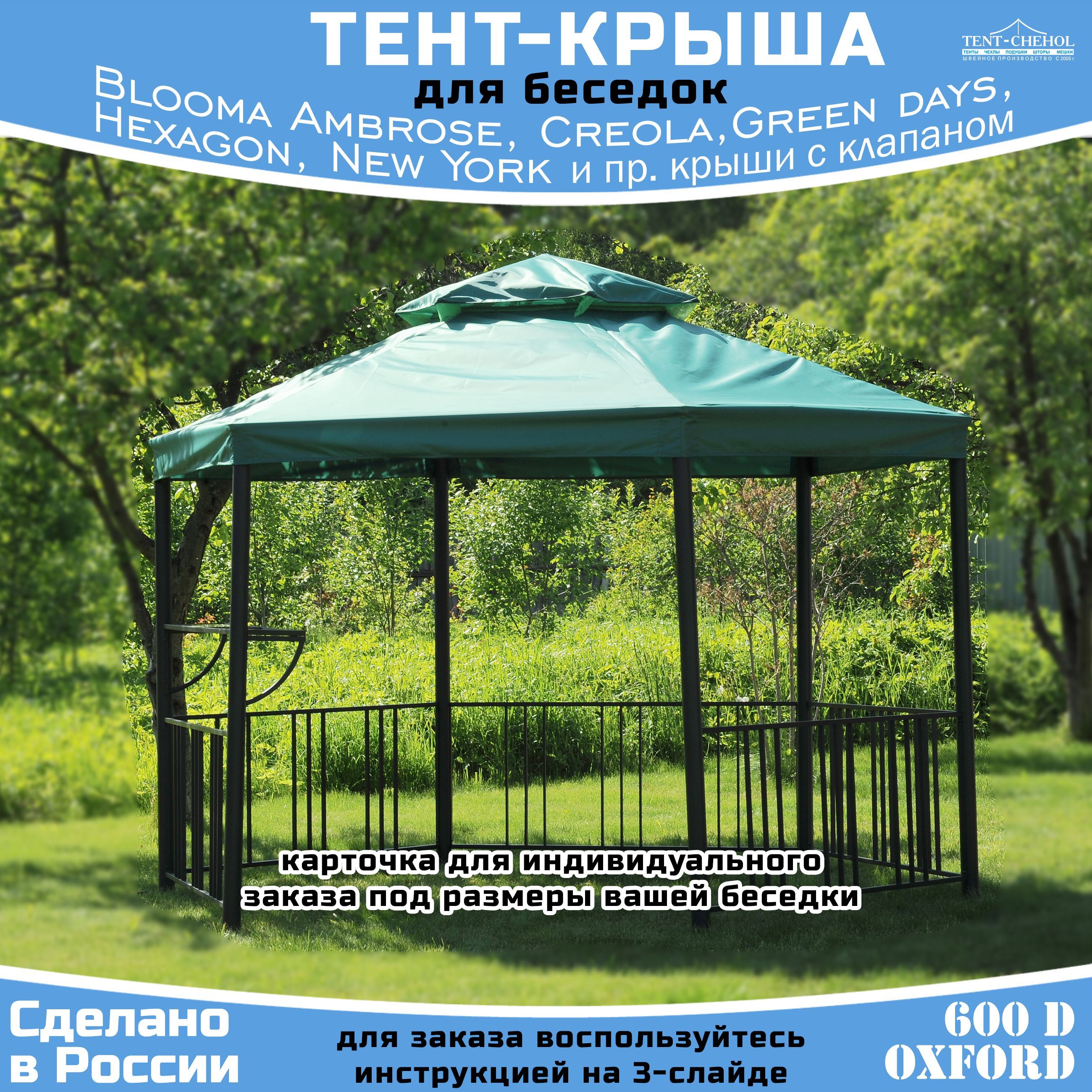 Запасной тент предназначен для замены покрытия крыши у шестиугольного павильона (беседки, шатра) Blooma Creola, Ambrose, New York1, Hexagon, Castorama Hexagon Gazebo, Green days и других шестигранных беседок с клапаном на крыше.Тент изготовлен из прочной ткани Оксфорд 600D c водоотталкивающей пропиткой PU1000.